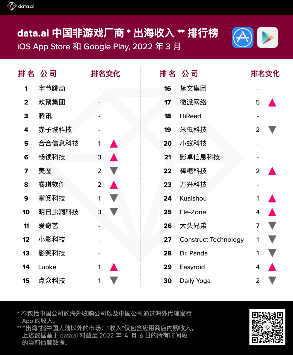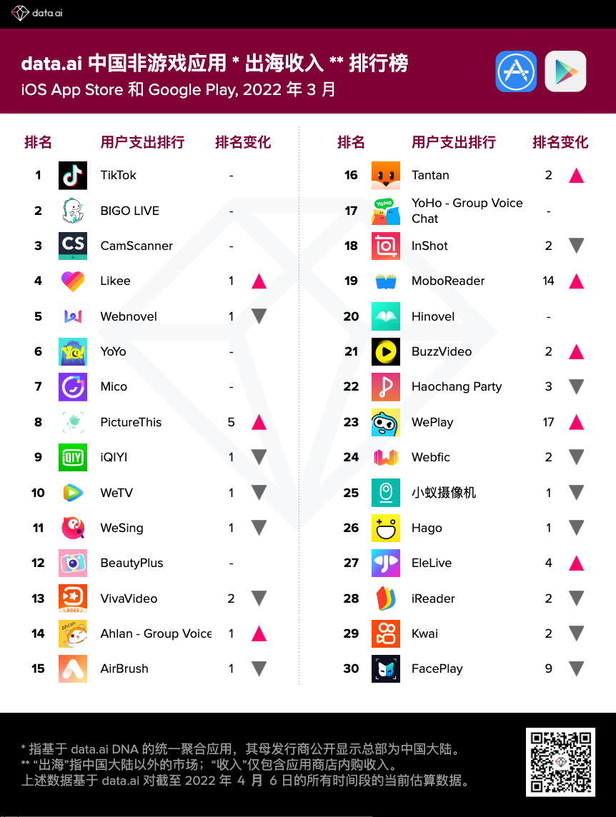 data.ai 发布了 2022 年 3 月我国非游戏厂商及使用出海收入30 强榜单。以下是陈述首要内容: