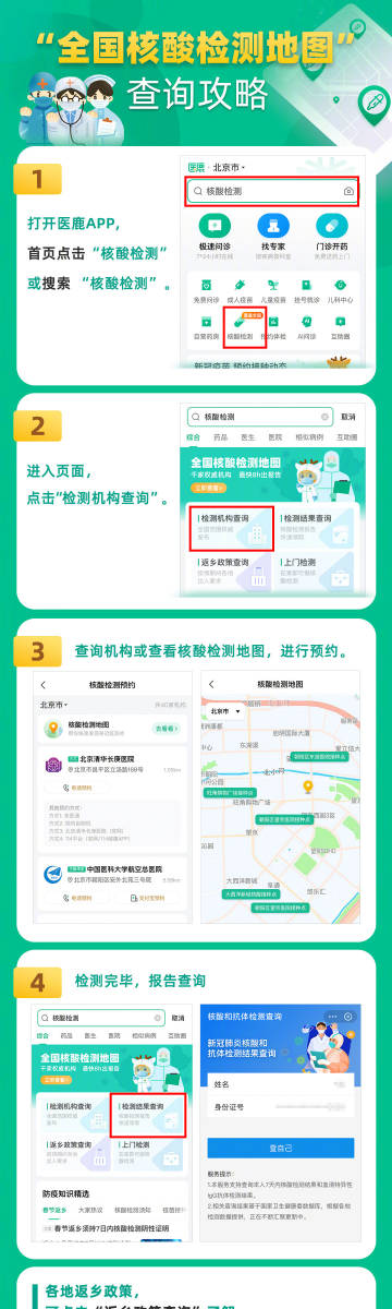 翻开医鹿 App,在主页点击「核酸检测」图标或查找关键词「核酸检测」,便可进入专题页面。