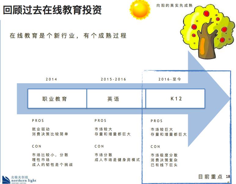 北极光在2014年对教育职业进行剖析的时分,从前画过一条时刻轴,开端把教育职业分红三个赛道:职业教育、英语、K12。其间,职业教育因为中心是作业驱动,决议方案相对简略,因而简单最早老练;其次,英语教育相对标准化;然后是K12教育,因为付费者和顾客别离导致决议方案杂乱,会是最终老练的子类别。有了这个时刻轴,你就有机遇在特定的时刻会集悉数的精力去重视一个子类别。