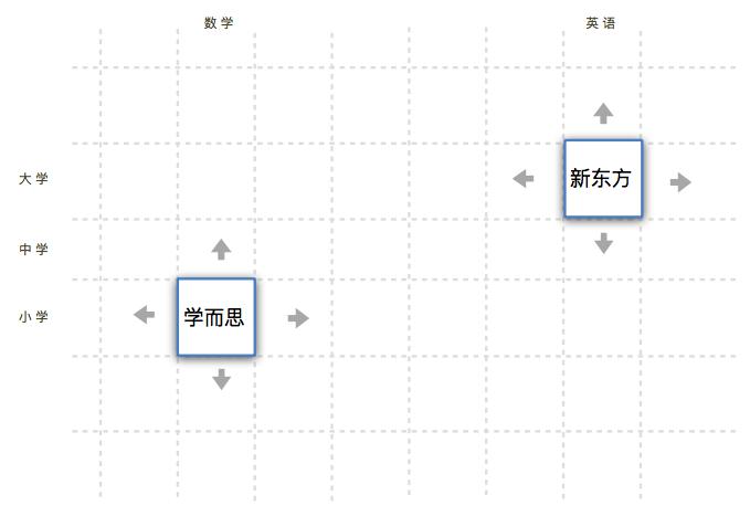 相似一个棋盘,你从一个格子起步,考虑到你品牌的影响延续性,往往会挑选格子周围扩张一格。咱们能够看到新东方和洽未来从不同的格子起步,今日变成了全品类的教育公司。